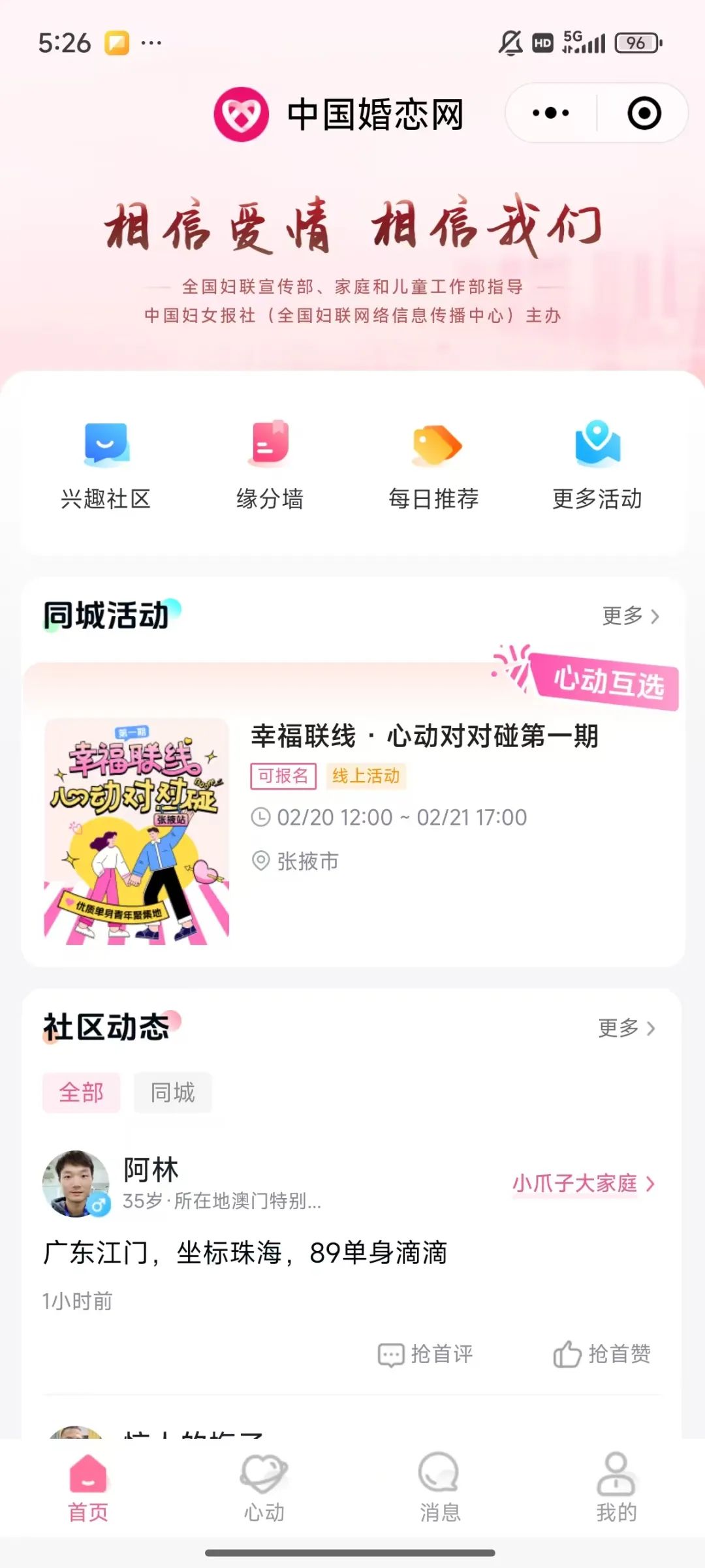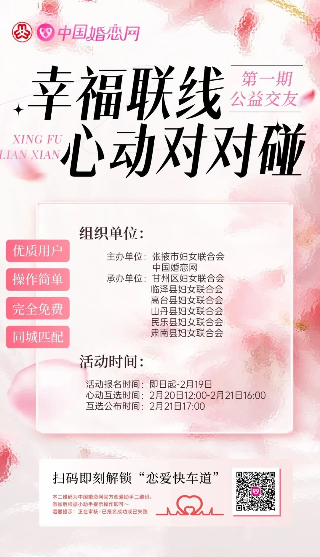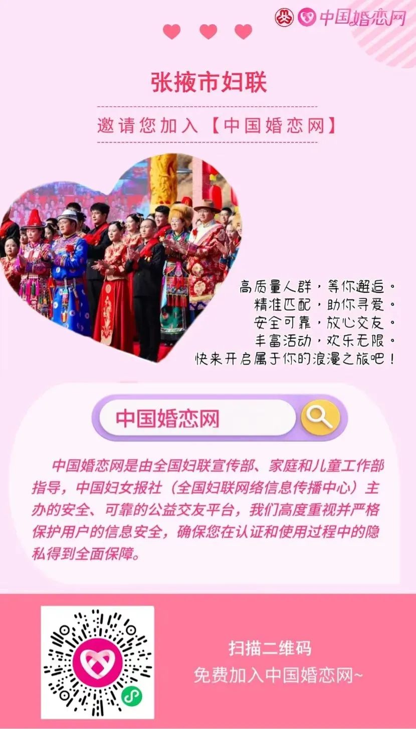为深化“家家幸福安康工程”,助力青年群体搭建真诚交友平台,张掖市妇联联合中国婚恋网推出“幸福联线·心动对对碰”婚恋交友品牌活动。首期活动于2月19—21日甜蜜开启,为单身青年解锁“遇见幸福”新方式!