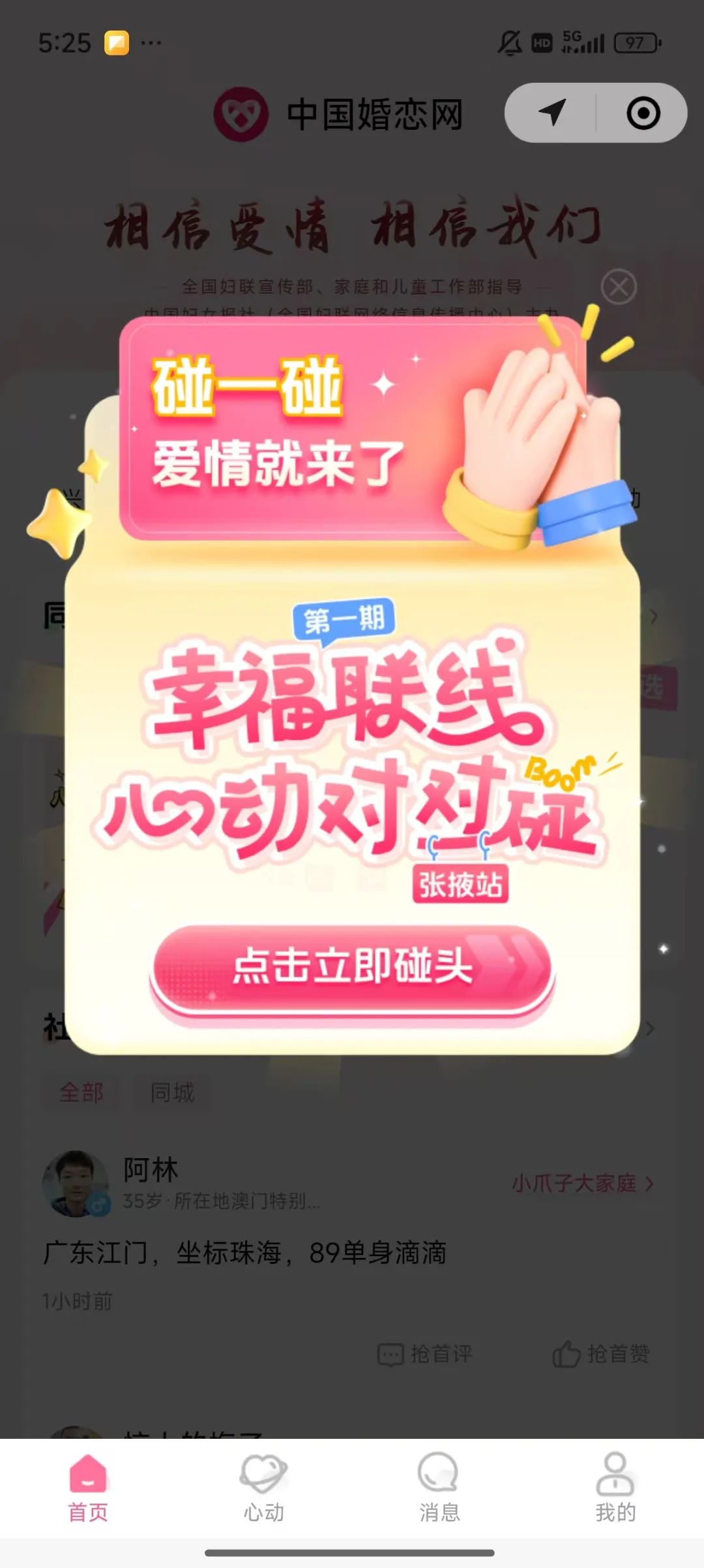 打破传统:“尴尬相亲”到“轻松社交”。平台上线首月已有830多人注册,受到了广大适龄青年的广泛关注。近期,市妇联精准聚焦当代青年婚恋痛点,以“轻压力、重共鸣”为理念,联合中国婚恋网策划了首期“幸福联线·心动对对碰”青年交友活动,打造线上沉浸式交友场景。