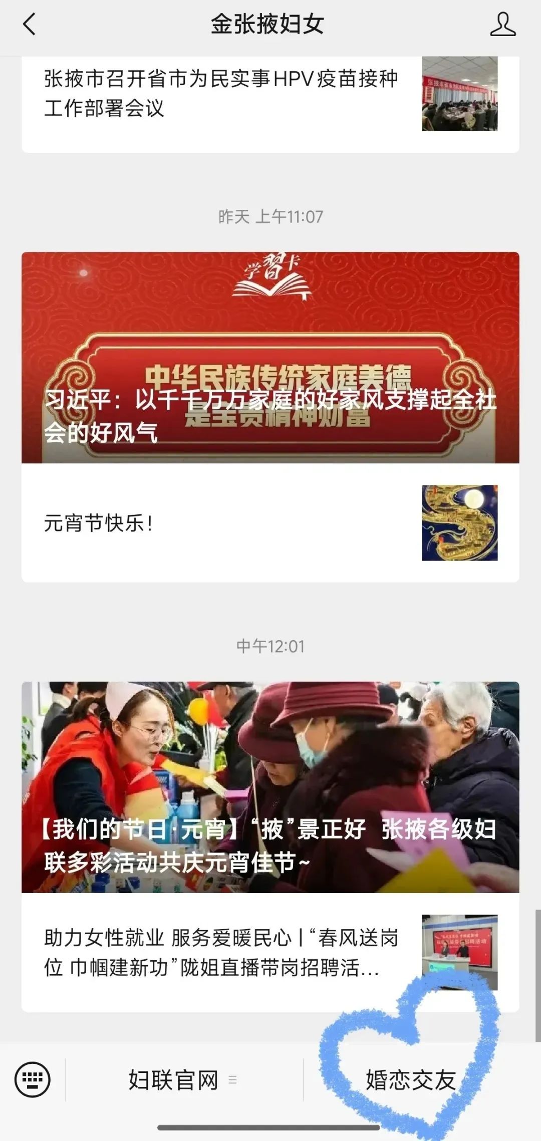 2.微信搜索公众号“金张掖妇女”并关注,点击菜单栏“婚恋交友”即可进入