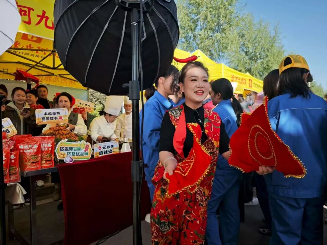 40多名巾帼主播与非遗手工艺人齐聚一堂,从麻辣火锅食材到传统月饼,从高台辣椒到手工粉条,各类甘味陇货好物琳琅满目,一边是农特产品、地方美食的“云端”热销,一边是非遗技艺的现场展演,“带货”与“传艺”双线并行,在丰收节全面展现巾帼风采。