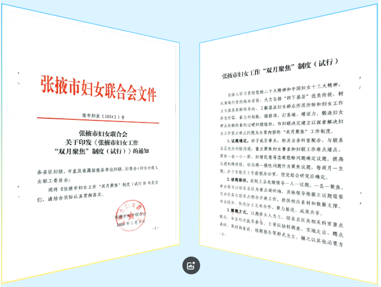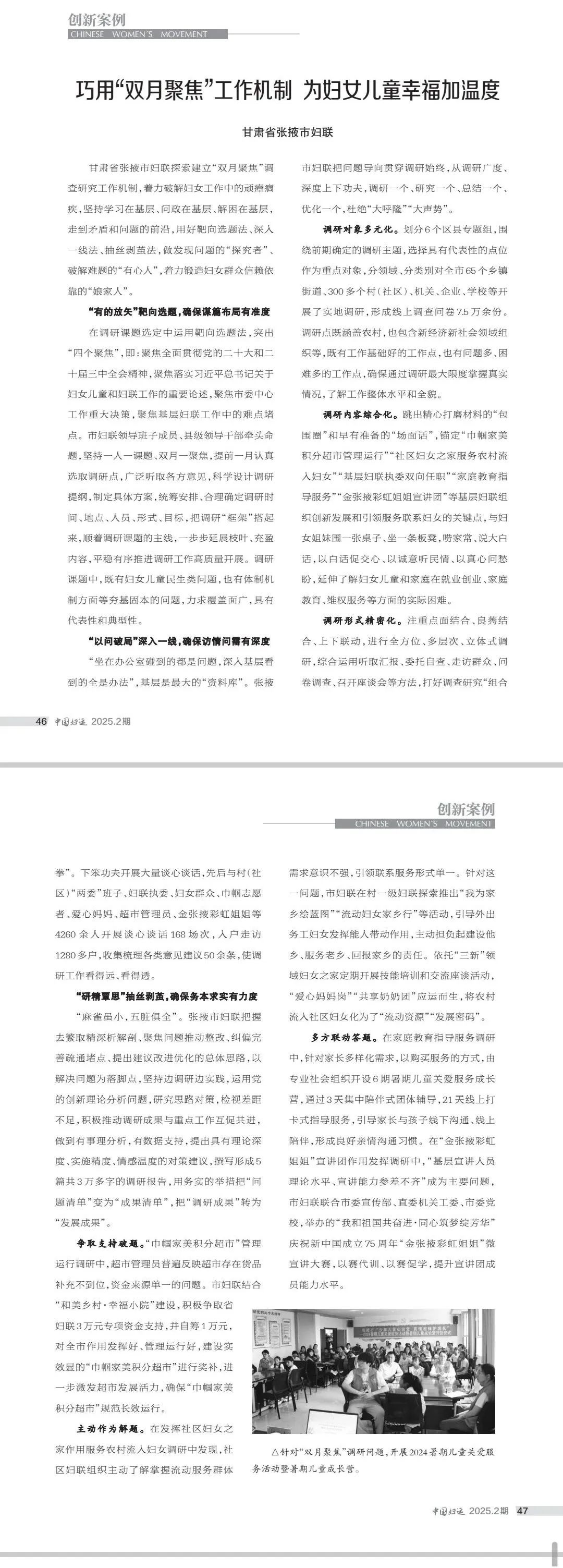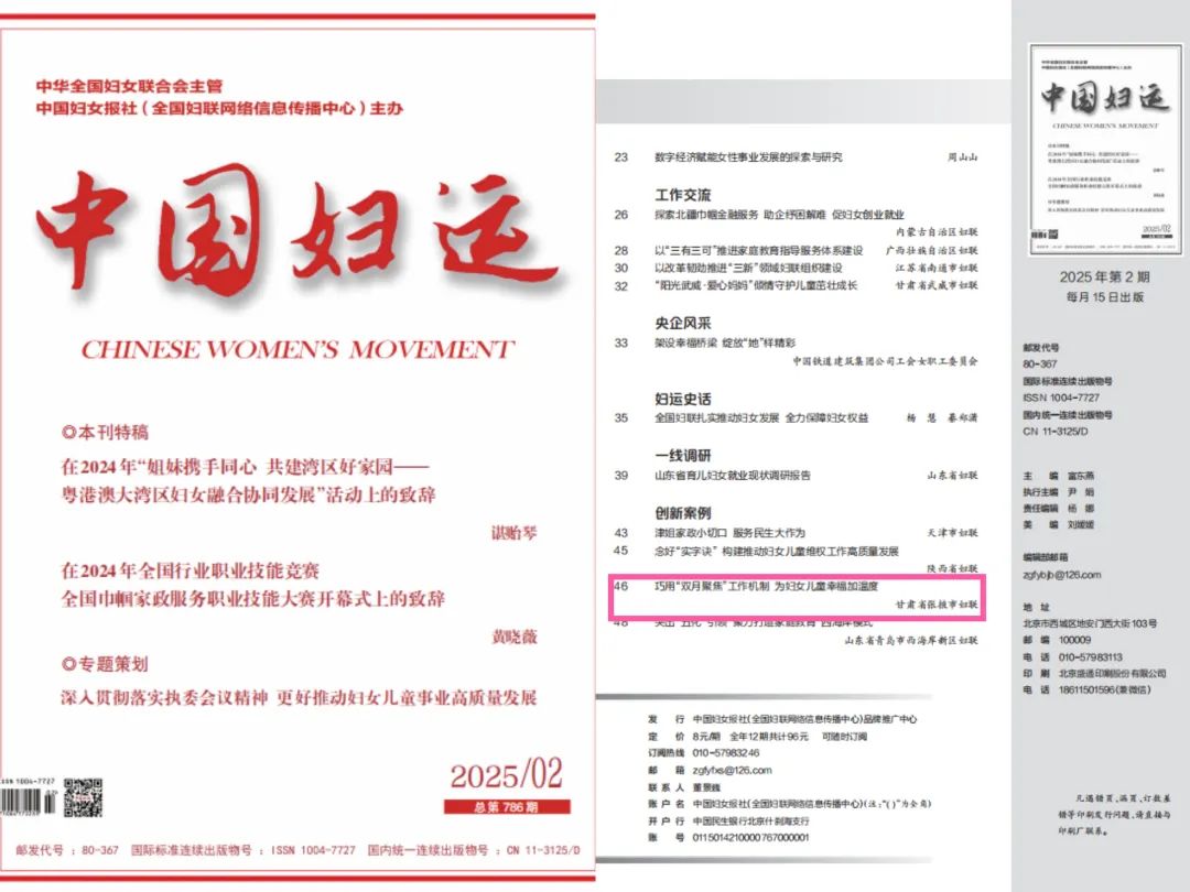 《中国妇运》2025年第2期以《巧用“双月聚焦”工作机制 为妇女儿童幸福加温度》为题,宣传张掖市妇联“双月聚焦”工作经验,全文如下: